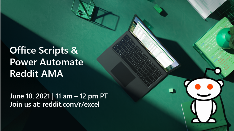 We’re so excited to announce our Reddit AMA (Ask Microsoft Anything) for Office Scripts and Power Automate! The AMA will take place in the Excel subreddit on Thursday, June 10 from 11:00 am –12:00 pm PT. You can add this event to your calendar and view it in your timezone here.